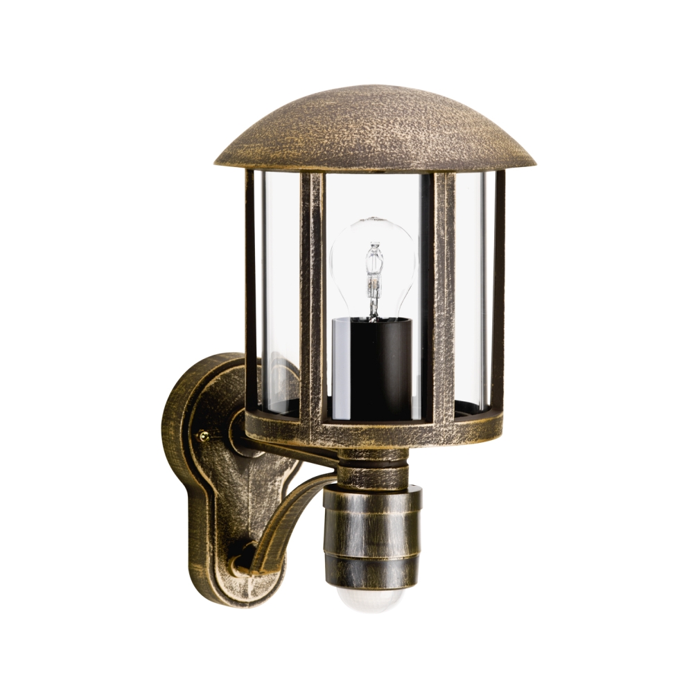 Wandarmatuur voor buitenshuis TYPE NO 1834 up, met bewegingsmelder E27 IP44, bruin, Messing gesatineerd
